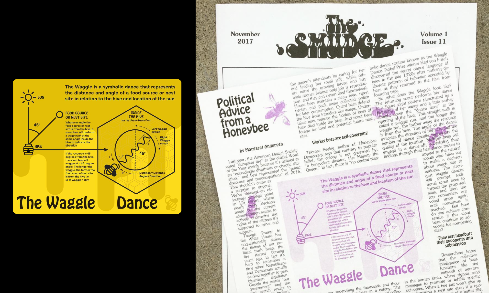 The Smudge Political Advice from a Honeybee Essay and illustrated infographic about honeybee democracy and how they communicate through dance. December 27, 2016 — 1 minute read Share this post The link has been copied!
